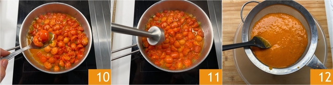 Nach der Kochzeit der Kirschtomaten stellen Sie die Hitze ab und legen einige ganze Kirschtomaten zum Anrichten beiseite 10. Pürieren Sie den Rest der Kirschtomaten mit einem Stabmixer 11, dann sieben Sie die Mischung durch ein feines Sieb 12.