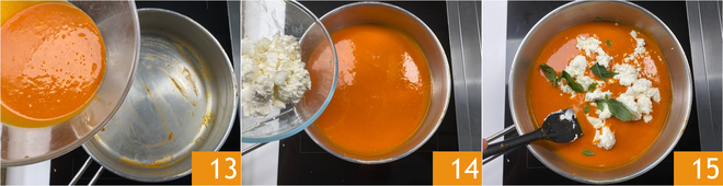 Geben Sie die entstandene Sauce in die Pfanne bei ausgeschalteter Hitze 13 und fügen Sie den Ricotta hinzu 14. Aromatisieren Sie mit frischem Basilikum und rühren Sie gut um, um alles zu vermischen 15.