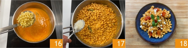 Gießen Sie die Pasta al dente ab und geben Sie sie direkt in die Sauce 16. Vermengen Sie sie mit Pecorino Romano 17, einer Prise Pfeffer, und Ihre Pasta mit Ricotta und Kirschtomaten ist fertig zum Servieren 18!