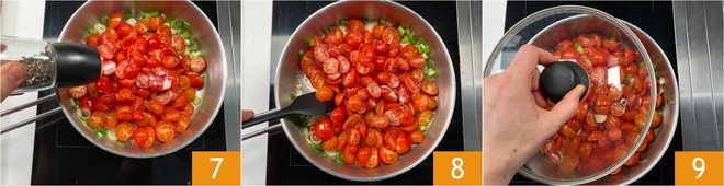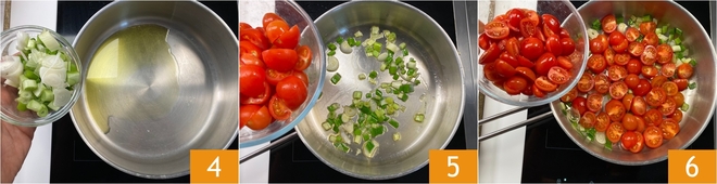 Erhitzen Sie in einem Topf das Öl und die Frühlingszwiebel 4 und lassen Sie sie für ein paar Minuten dünsten, fügen Sie dann die Kirschtomaten 5 und die Datterini hinzu 6.
