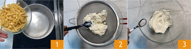 Um die Pasta mit Ricotta und Walnüssen zuzubereiten, geben Sie zuerst die Fusilli in reichlich kochendes, gesalzenes Wasser 1. In der Zwischenzeit kümmern Sie sich um die Ricotta-Creme: Sieben Sie diese in eine große Schüssel, indem Sie sich mit einem Spatel oder dem Rücken eines Löffels helfen 2, damit sie schön glatt und samtig wird. Würzen Sie sie mit einer Prise Salz 3.