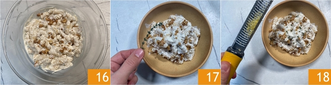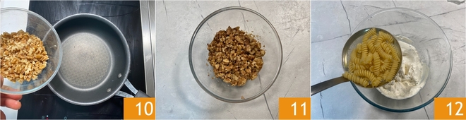 Dann geben Sie diese in eine gut erhitzte, beschichtete Pfanne 10 und rösten Sie sie 4-5 Minuten lang, wobei Sie häufig umrühren, bis sie goldbraun sind und ihr Aroma entfalten. Schalten Sie die Hitze ab, geben Sie sie in die Schüssel 11 und lassen Sie sie abkühlen. In der Zwischenzeit ist die Pasta al dente. Lassen Sie die Fusilli abtropfen (ohne das Wasser wegzuschütten) und geben Sie sie direkt in die Schüssel mit dem gewürzten Ricotta 12.