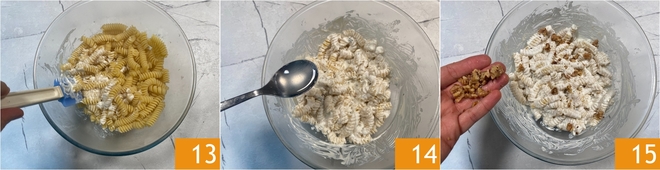 Rühren Sie gut um 13 und fügen Sie nach und nach ein wenig Kochwasser hinzu, wobei Sie weiter umrühren, bis Sie die gewünschte Konsistenz erreicht haben 14. Zum Schluss fast alle gerösteten Walnüsse hinzufügen, einige für die endgültige Dekoration aufbewahren 15.