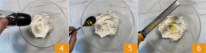 Fügen Sie auch eine Prise Pfeffer 4, einen Schuss natives Olivenöl extra 5 und den größten Teil der abgeriebenen Zitronenschale 6 hinzu.