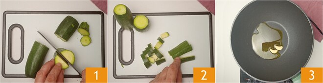 Um die Pasta mit Robiola und Zucchini zuzubereiten, waschen Sie zuerst die Zucchini, trocknen Sie sie ab und entfernen Sie die Enden. Schneiden Sie sie in der Mitte durch 1, in Stifte und schließlich in Würfel 2. In einem großen Wok den Knoblauch im Olivenöl anbraten 3.