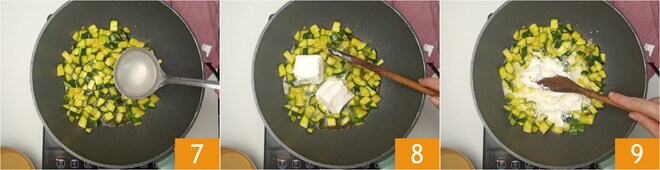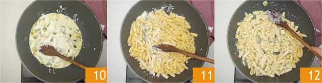 Behalten Sie zwei Kellen Nudelwasser bei und geben Sie sie zu den Zucchini 7. Fügen Sie die Robiola hinzu 8 und mischen Sie, um sie zusammen mit zwei Esslöffeln Milch schmelzen zu lassen 9.