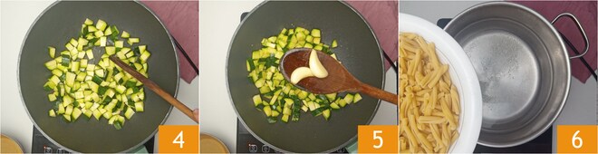 Fügen Sie die gewürfelten Zucchini hinzu und geben Sie das Salz dazu, mischen Sie alles und kochen Sie es 5 Minuten lang 4. Entfernen Sie den Knoblauch 5. In der Zwischenzeit kochen Sie die Pasta in reichlich gesalzenem Wasser nach den auf der Packung angegebenen Kochzeiten 6.