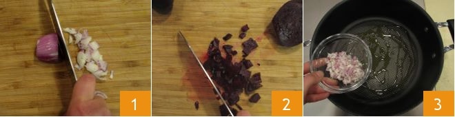 Um die Pasta mit Roter Bete und Pecorino zuzubereiten, reinigen und hacken Sie zunächst die Schalotte mit einem Messer 1. Schneiden Sie die Roten Beten in Scheiben und dann in Würfel 2. Stellen Sie einen Topf mit gesalzenem Wasser auf den Herd, um die Pasta zu kochen. Geben Sie einen Spritzer Öl in eine Pfanne und fügen Sie die gehackte Schalotte hinzu 3.