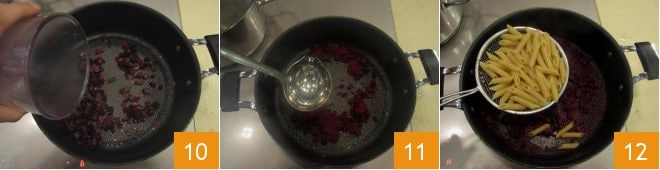 Entnehmen Sie etwa anderthalb Esslöffel des Würzens und pürieren Sie es mit einem halben Schöpflöffel heißem Wasser (7-8), etwa 20 g, (aus demselben Topf, in dem die Pasta gekocht wird), sodass Sie eine gleichmäßige Creme erhalten 9, die Sie dem Würzen in der Pfanne hinzufügen 11.