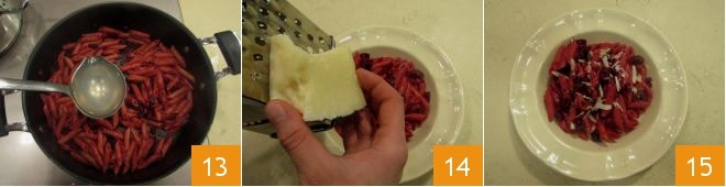 Fügen Sie eine Kelle Pastawasser hinzu 13 und mischen Sie alles bei schwacher Hitze gut durch, bis es gar ist. Servieren Sie Ihre Pasta heiß, würzen Sie sie mit schwarzem Pfeffer und einer Prise grob geriebener Pecorino romano (14-15).