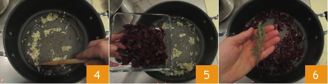 Lassen Sie es wenige Augenblicke anbraten 4. Fügen Sie die Rote Bete hinzu 5 und verleihen Sie dem Gericht mit frischem Thymian Duft 6.