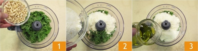 Um die Pasta mit Rucola-Pesto, in Öl eingelegte Auberginen und Stracciatella zuzubereiten, macht ihr zuerst das Pesto. Wascht die Rucola gut, trocknet sie und gebt sie in die Tasse eines Mixers. Fügt auch die Pinienkerne 1, den Grana, den Pecorino 2 und eine Prise Salz hinzu. Jetzt gießt ihr das Olivenöl extra vergine 3 hinzu und fangt an zu mixen.