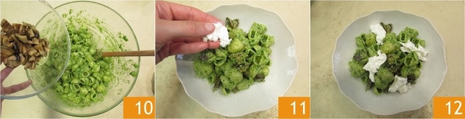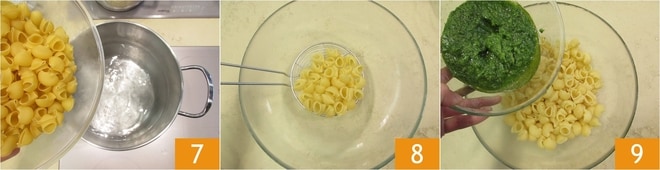 Sobald das Wasser zu kochen beginnt, gebt die Pasta hinzu 7 und kocht sie für die angegebene Zeit. Gießt sie ab und gebt sie in eine Schüssel 8, fügt das Pesto hinzu 9 und mischt gut.