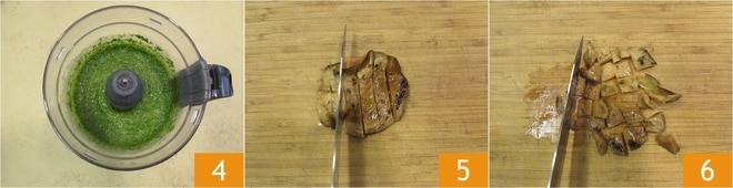 Ihr müsst eine cremige Konsistenz 4 erhalten. Stellt einen Topf mit gesalzenem Wasser für das Kochen der Pasta auf den Herd. Legt die Auberginen auf ein Schneidebrett und schneidet sie zuerst in Streifen 5 und dann in Würfel von etwa 2 cm 6.