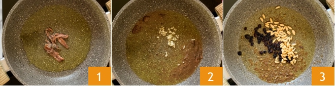 Um die Pasta c'anciova zuzubereiten, beginnen Sie damit, die Sardellen in eine Pfanne mit etwas Öl zu geben 1 und rühren Sie häufig um, damit sie sich nicht vollständig auflösen. Fügen Sie dann zunächst den fein gehackten Knoblauch hinzu 2, dann die Pinienkerne und die Rosinen 3 und lassen Sie alles für ein paar Minuten durchziehen.