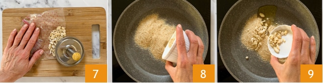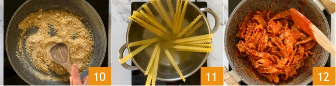 In der Zwischenzeit bringen Sie einen Topf mit Wasser für die Nudeln zum Kochen und kümmern sich auch um die „muddica atturrata“ (also das geröstete Paniermehl). Legen Sie die Mandeln in einen Beutel und zerkleinern Sie sie grob mit einem Fleischklopfer oder einem Gewicht 7. Geben Sie das Paniermehl in eine beschichtete Pfanne 8 und fügen Sie die zerkleinerten Mandeln hinzu 9.