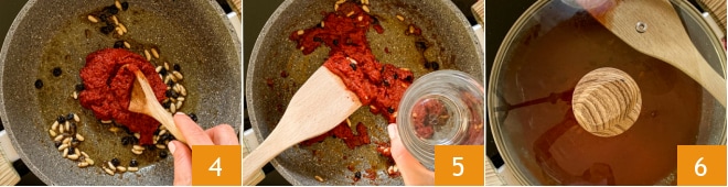 Fügen Sie an dieser Stelle das Tomatenmark 4 und das Wasser 5 hinzu. Würzen Sie mit Salz, Pfeffer und einer Prise Zucker, setzen Sie den Deckel auf und lassen Sie alles 10 Minuten bei schwacher Hitze köcheln 6.