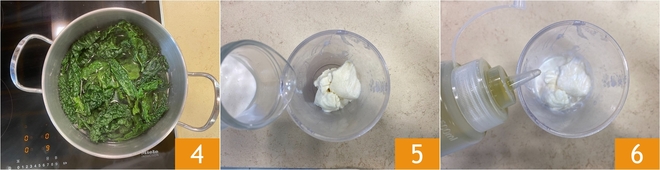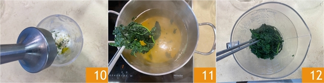 Pürieren Sie alles mit einem Stabmixer, bis eine glatte und samtige Creme entsteht 10. Stellen Sie sie beiseite. Nehmen Sie den Schwarzkohl mit einer Zange oder einem Schaumlöffel aus dem Wasser und bewahren Sie das Kochwasser auf 11. Geben Sie ihn in das Mixglas 12.