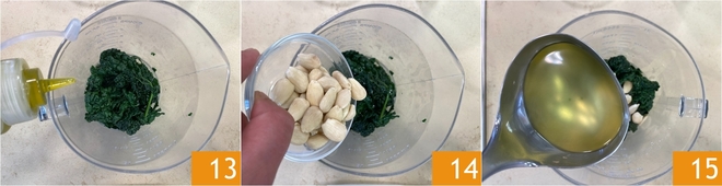 Fügen Sie das Öl 13, die geschälten Mandeln 14 und eine Kelle des heißen Kochwassers hinzu 15.