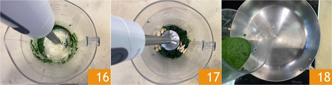 Fügen Sie schließlich den Grana Padano hinzu 16 und pürieren Sie, bis eine cremige und leuchtend farbige Mischung entsteht 17. Geben Sie die Schwarzkohlcreme in eine große Pfanne 18.
