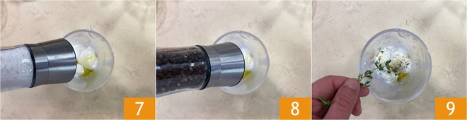 Würzen Sie mit einer Prise Salz 7, einer Prise Pfeffer 8 und ein paar frischen Thymianblättern 9.