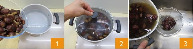 Um die Pasta mit Steinpilzen, Wurst und zerbröckelten Kastanien zuzubereiten, geben Sie zuerst die Kastanien in einen Topf mit Wasser 1, dann decken Sie mit einem Deckel ab 2 und lassen Sie sie 30 Minuten lang kochen. Nach Ablauf dieser Zeit machen Sie den Test mit dem Zahnstocher: Stechen Sie sie an, um zu überprüfen, ob sie gar sind, und falls ja, gießen Sie sie ab 3.