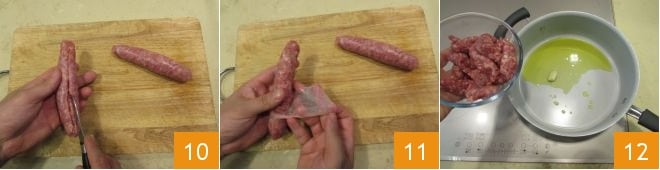 Kümmern Sie sich jetzt um die Wurst: Machen Sie einen längsseitigen Schnitt und ritzen Sie die äußere Schicht vorsichtig ein 10. Entfernen Sie die Pelle 11 und zerkleinern Sie sie grob. Dann geben Sie das Öl in einen Topf, fügen Sie den Knoblauch hinzu und lassen Sie ihn goldbraun werden. Sobald er gut gebräunt ist, geben Sie die Wurst hinzu 12 und lassen Sie sie bei starker Hitze anbraten.