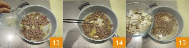 Löschen Sie mit Weißwein ab 13, entfernen Sie den Knoblauch 14 und lassen Sie es weitere 10 Minuten kochen. Fügen Sie die zuvor geschnittenen Pilze hinzu 15, geben Sie eine Prise Salz und Pfeffer hinzu.