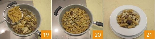 Gießen Sie die Pasta sehr al dente ab und geben Sie sie direkt in den Topf 19, rühren Sie alles um und lassen Sie es ein paar Minuten ziehen 20; dann servieren Sie Ihre Pasta mit Steinpilzen, Wurst und zerbröckelten Kastanien 21.