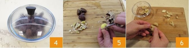Stellen Sie sie in einer abgedeckten Schüssel beiseite 4: Auf diese Weise wird die äußere Schicht durch den Dampf weicher und Sie können sie leichter schälen. Sobald sie abgekühlt sind, schälen Sie die Kastanien 5, Sie sollten 150 g gereinigte Kastanien erhalten, und zerbröckeln Sie einige davon mit den Händen 6, während Sie die anderen ganz beiseite legen.