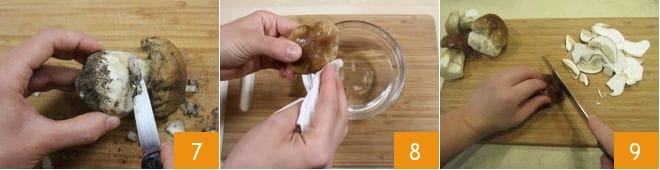 Jetzt kümmern Sie sich um die Reinigung der Steinpilze: Mit einem kleinen Messer entfernen Sie das untere Ende des Pilzstiels 7 und reinigen Sie die obere Seite mit einem feuchten Tuch. Wenn zu viel Erde vorhanden ist, können Sie sie schnell unter fließendem Wasser abspülen und mit Küchenpapier trocknen 8. Sobald alle Pilze gereinigt sind, schneiden Sie sie fein 9.