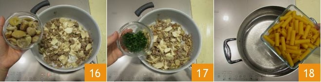 Warten Sie 3-4 Minuten, rühren Sie gelegentlich um und fügen Sie auch die Kastanien hinzu 16. Geben Sie die gehackte Petersilie hinzu 17 und kochen Sie die Pasta in reichlich kochendem Wasser, das nach Belieben gesalzen wurde 18.