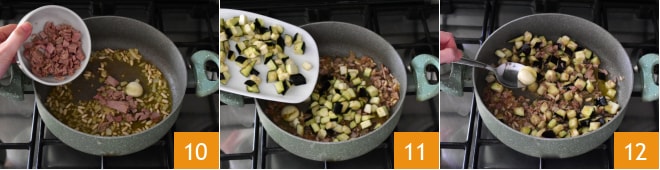 und schließlich den Thunfisch dazugeben und für etwa eine weitere Minute ziehen lassen 10. An diesem Punkt können Sie die gut abgespülten und abgetropften Auberginen hinzufügen 11 und lassen Sie sie 5-10 Minuten kochen. Entfernen Sie den Knoblauch 12,