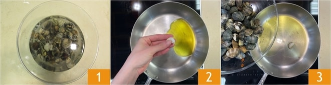 Um die Pasta mit Venusmuscheln, Garnelen und Queller zuzubereiten, lassen Sie zuerst die Venusmuscheln in reichlich Salzwasser für ein paar Stunden wässern und wechseln dabei alle halbe Stunde das Wasser, um eventuell vorhandenen Sand zu entfernen 1. Sobald sie gewässert sind, erhitzen Sie Olivenöl in einer Pfanne mit einer Knoblauchzehe 2, dann geben Sie die Venusmuscheln 3 und einen Chili dazu.