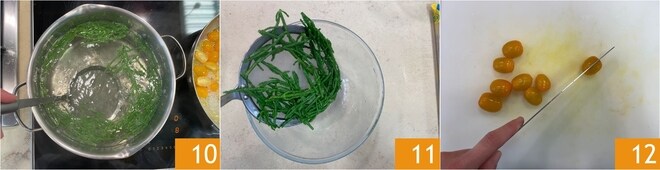 Blanchieren Sie sie etwa eine Minute lang 10, dann schöpfen Sie sie ab, wobei Sie das Wasser aufbewahren, das Sie zum Kochen der Pasta benötigen 11. Waschen und halbieren Sie die Kirschtomaten 12.