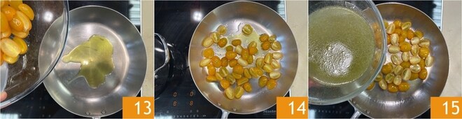 Erhitzen Sie in einer Pfanne einen Schuss Öl, dann geben Sie die Kirschtomaten hinein 13 14 und würzen Sie mit dem Kochwasser der Venusmuscheln 15. Kochen Sie für 4-5 Minuten.