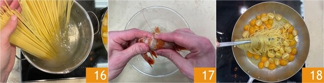 Jetzt kochen Sie die Linguine al dente in kochendem Wasser und orientieren sich an der auf der Packung angegebenen Zeit 16. In der Zwischenzeit reinigen Sie die Garnelen, indem Sie Kopf, Panzer und Darm entfernen 17. Wenn die Pasta fertig ist, lassen Sie sie direkt in der Pfanne mit den Kirschtomaten abtropfen 18.