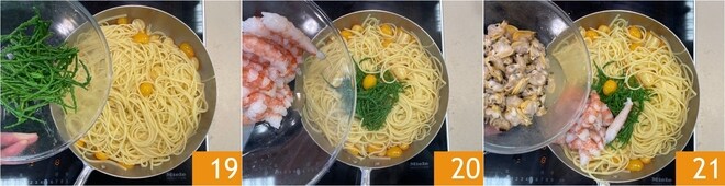 Fügen Sie den Queller 19, die Garnelen 20 und die geschälten Venusmuscheln 21 hinzu.