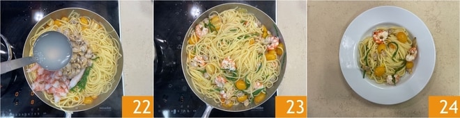 Geben Sie eine Kelle des Kochwassers hinein 22 und schwenken Sie es kurz, um alles zu verbinden 23. Servieren Sie sofort Ihre Pasta mit Venusmuscheln, Garnelen und Queller, indem Sie mit gehackter frischer Petersilie und den zur Seite gestellten Venusmuscheln mit Schale garnieren 24!