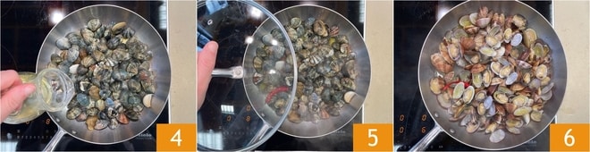 Wenn das Öl anfängt zu brutzeln, löschen Sie es mit Weißwein ab 4 und lassen Sie den Alkohol verdampfen, dann decken Sie es mit einem Deckel ab 5 und lassen Sie die Venusmuscheln bei starker Hitze öffnen 6; es wird etwa 5 Minuten dauern.