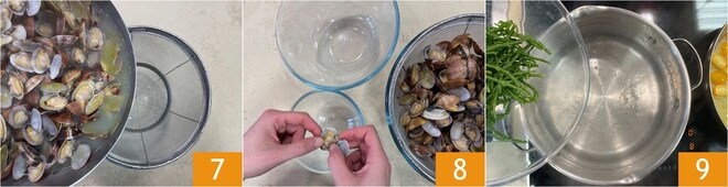 Sobald sie geöffnet sind, lassen Sie die Venusmuscheln durch ein Sieb abtropfen, um das Kochwasser aufzufangen 7. Entfernen Sie die Schalen von der Hälfte und bewahren Sie sie zusammen mit den ganzen auf 8. In einem anderen Topf bringen Sie Wasser zum Kochen, dann geben Sie den Queller hinein 9.