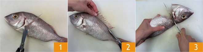 Um die Pasta mit weißem Fischragout zuzubereiten, beginnen Sie damit, den Schnapper zu säubern und zu filetieren: Schneiden Sie zuerst den Bauch auf, um ihn auszunehmen. Schneiden Sie dann die Flossen ab 1 2 und entfernen Sie den Kopf 3.