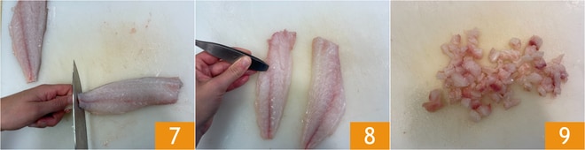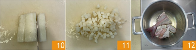 Schneiden Sie den Kabeljau auf die gleiche Größe 10 11. Legen Sie die Gräten und die Reinigungsausbeute des Schnappers in einen Topf 12.