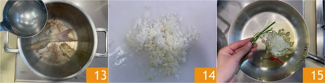 Rösten Sie die Ausbeute gut an, bedecken Sie dann mit 2 Schöpfkellen Wasser, salzen Sie und bringen Sie es zum Kochen 13. Schälen und hacken Sie die Zwiebel 14. Geben Sie in eine Pfanne das Öl, die Zwiebel, die Petersilienzweige und den Chili 15. Lassen Sie die Zwiebel goldbraun werden.