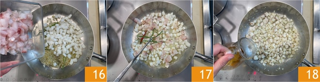 Geben Sie die Fischstückchen hinzu 16 und lassen Sie sie einige Minuten bräunen, entfernen Sie dann den Chili und die Petersilienzweige 17. Löschen Sie mit dem Brandy ab 18.