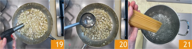 Flambieren Sie mit einem Bunsenbrenner 19 oder den Flammen des Herds. Salzen Sie und geben Sie eine Schöpfkelle Wasser hinzu 20, kochen Sie noch 2 Minuten weiter. Kochen Sie die Spaghettoni 21.