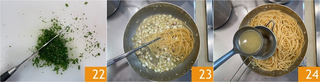 Während die Pasta kocht, hacken Sie die Petersilienblätter, den Thymian und den Majoran 22. Lassen Sie die Spaghetti abtropfen, bevor sie ganz gar sind, und geben Sie sie in die Pfanne mit dem Fisch 23. Fügen Sie den gefilterten Fischfond 24 hinzu und gegebenenfalls Kochwasser der Pasta.