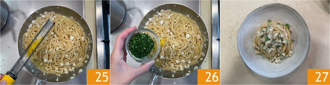Schließen Sie die Pasta bei ausgeschalteter Flamme mit Öl, Zitronenschale 25, Kräuterhack 26 und Pfeffer ab. Servieren Sie die Pasta mit weißem Fischragout und dekorieren Sie mit frischem Majoran 27.