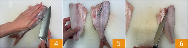 Schneiden Sie den Fisch in der Mitte durch 4, um die Filets 5 zu erhalten, und entfernen Sie auch das Bauchstück 6. Entfernen Sie die Reinigungsausbeute nicht, da sie später für die Zubereitung eines Fischfonds verwendet wird.