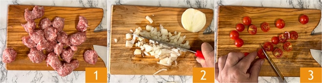 Um die Pasta mit Wurst zuzubereiten, setzt zuerst einen Topf mit Wasser auf, um die Pasta darin zu kochen. Beginnt mit der Vorbereitung der Zutaten: Entfernt die Pelle der Wurst und schneidet sie in Stücke 1. Schält die Zwiebel und hackt sie fein 2. Wascht schließlich die Kirschtomaten und halbiert sie 3.